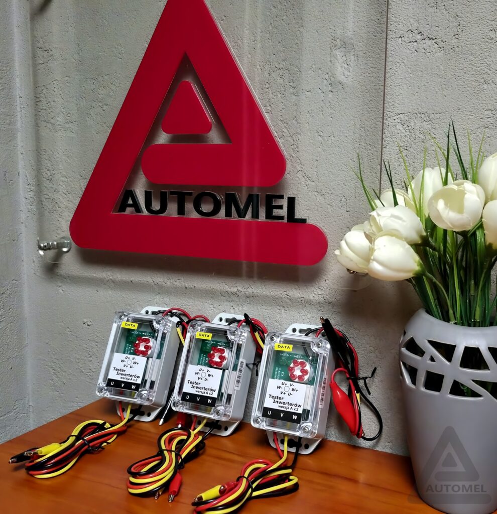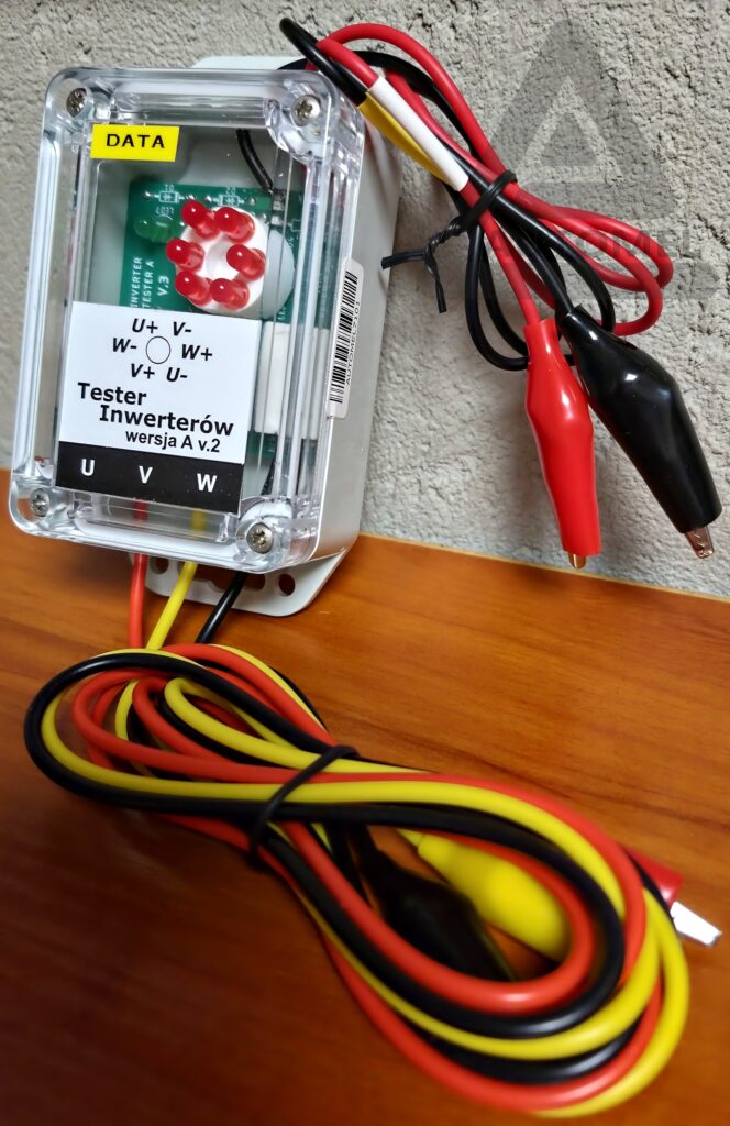 Tester przyłączamy zgodnie z opisami umieszczonymi na kablach, tzn. przewód „U” łączymy z wyjściem inwertera oznaczonym jako „U” lub z zaciskiem zasilania trójfazowego AC oznaczonym jako „L1” lub „R”, przewody „V” i „W” również łączymy w analogiczny sposób z odpowiednimi zaciskami tego samego obwodu.